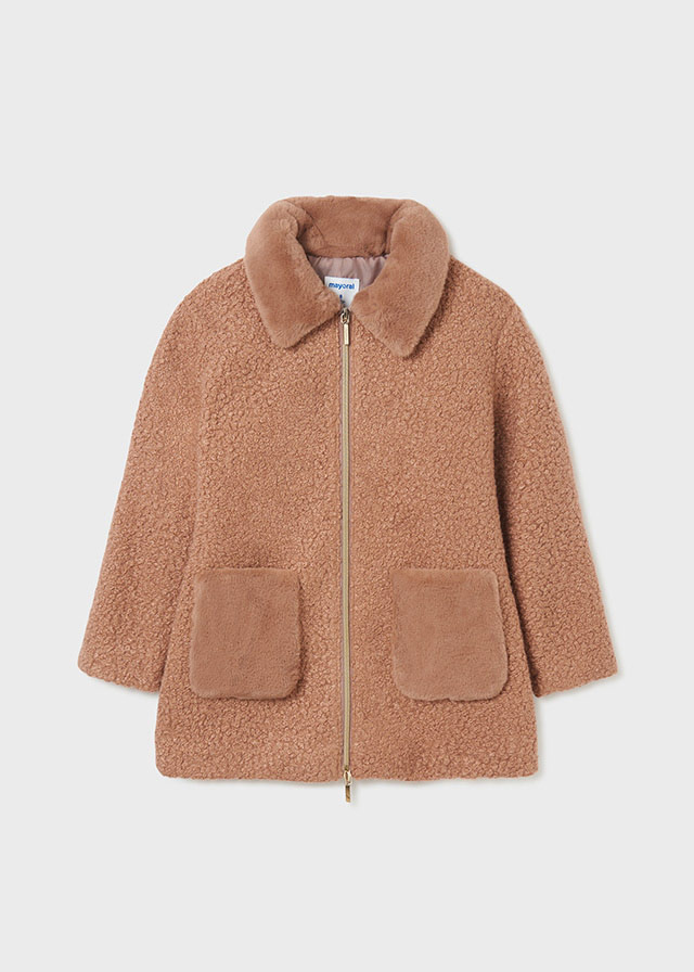 Płaszcz z długim rękawem dla dziewczynki. Kołnierzyk z klapami. Zapięcie na środku na zamek błyskawiczny. Z przodu funkcjonalne kieszenie.