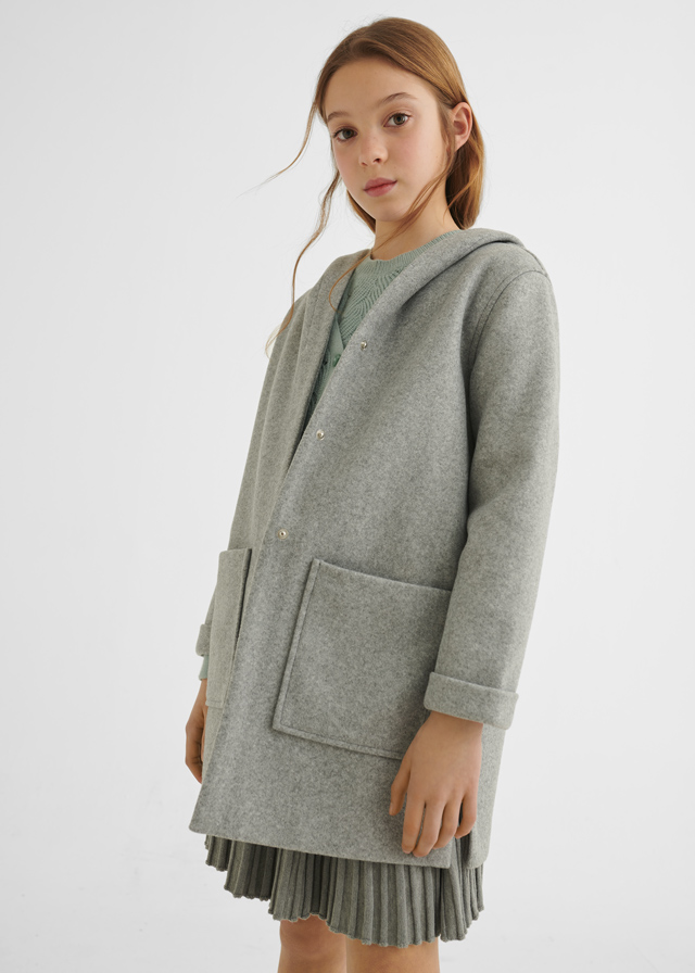 Płaszcz z długim rękawem dla dziewczynki. Model z kapturem. Zapięcie na ukryte zatrzaski, które pozwolą w łatwy sposób założyć ubranko.