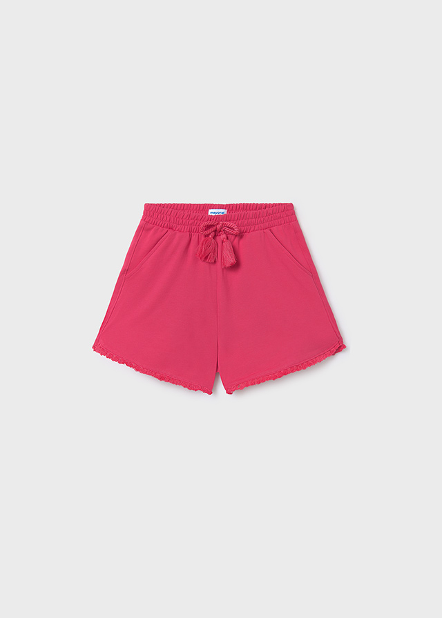 Krótkie spodnie typu szorty dla dziewczynki 8 do 16 lat. Regulowana gumka w pasie dla lepszego dopasowania. Artykuł wykonany ze 100% bawełny. Ze szlufkami w pasie. Z przodu funkcjonalna kieszeń. Model gładki.