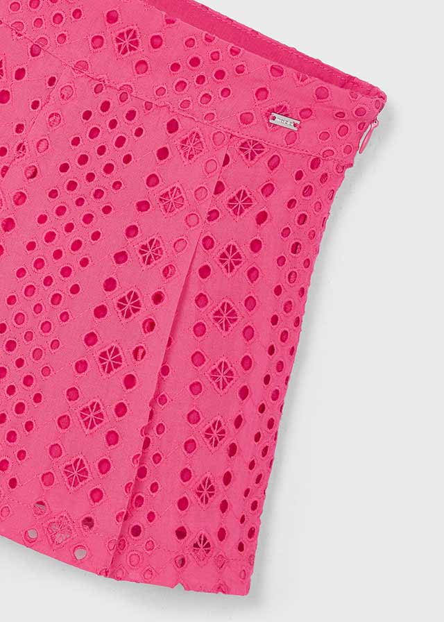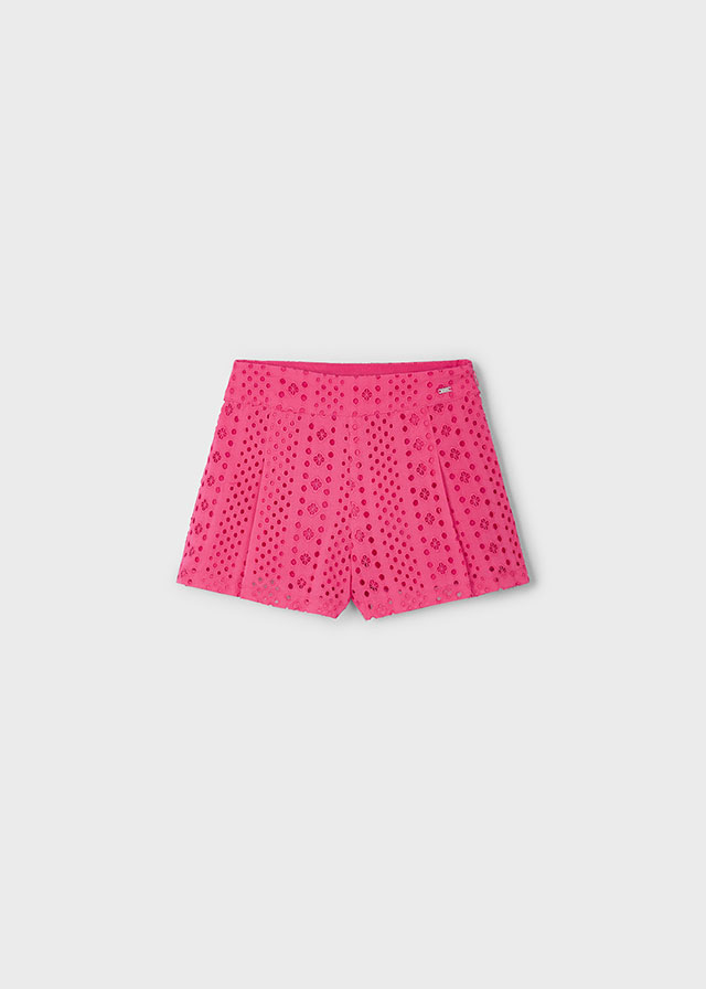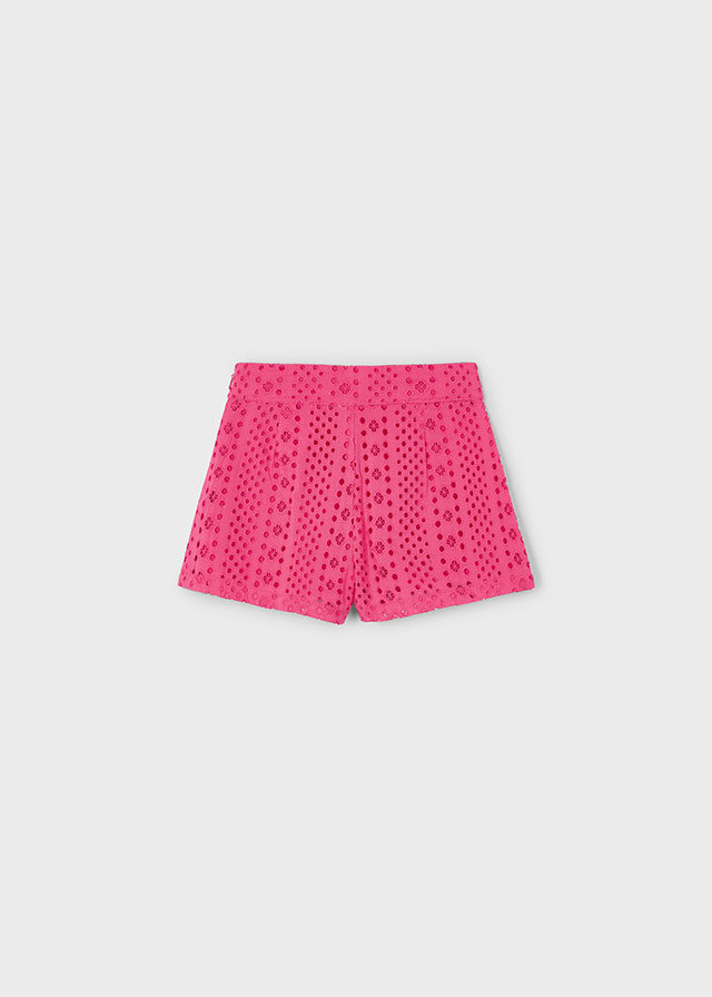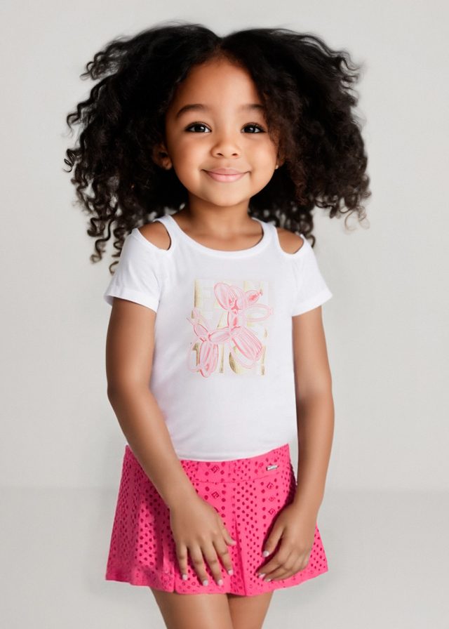 Krótkie spodnie typu szorty dla dziewczynki. Regulowana gumka w pasie dla lepszego dopasowania. Artykuł wykonany ze 100% bawełny. Ze szlufkami w pasie. Z przodu funkcjonalna kieszeń. Model gładki.